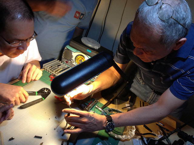 You would’ve thought that—dozens of fixed Vacumatics later—I would be a master at this, and maybe I thought so, too. But at TOB’s workshop, I made another dumb newbie mistake: using a tool I didn’t know without reading or following instructions. The tool in point was TOB’s heat gun, which sends out a blast of hot air like some kind of light saber. I was kidding my tocayo about his having a heat gun instead of a hair dryer because—well, if you see his shiny, saintly pate, you’ll understand why—and then I turned the heat gun on a 1940 Vacumatic that I was going to use to demonstrate my graduate-level skills to the nervous newbies. But, alas, before I could say “This is how…”, the heat gun vaporized a chunk of the pen’s barrel, and there in a smoky wisp went another of George S. Parker’s creations, having survived for over 70 years before some dumb monkey with a PhD zapped it to pen heaven.